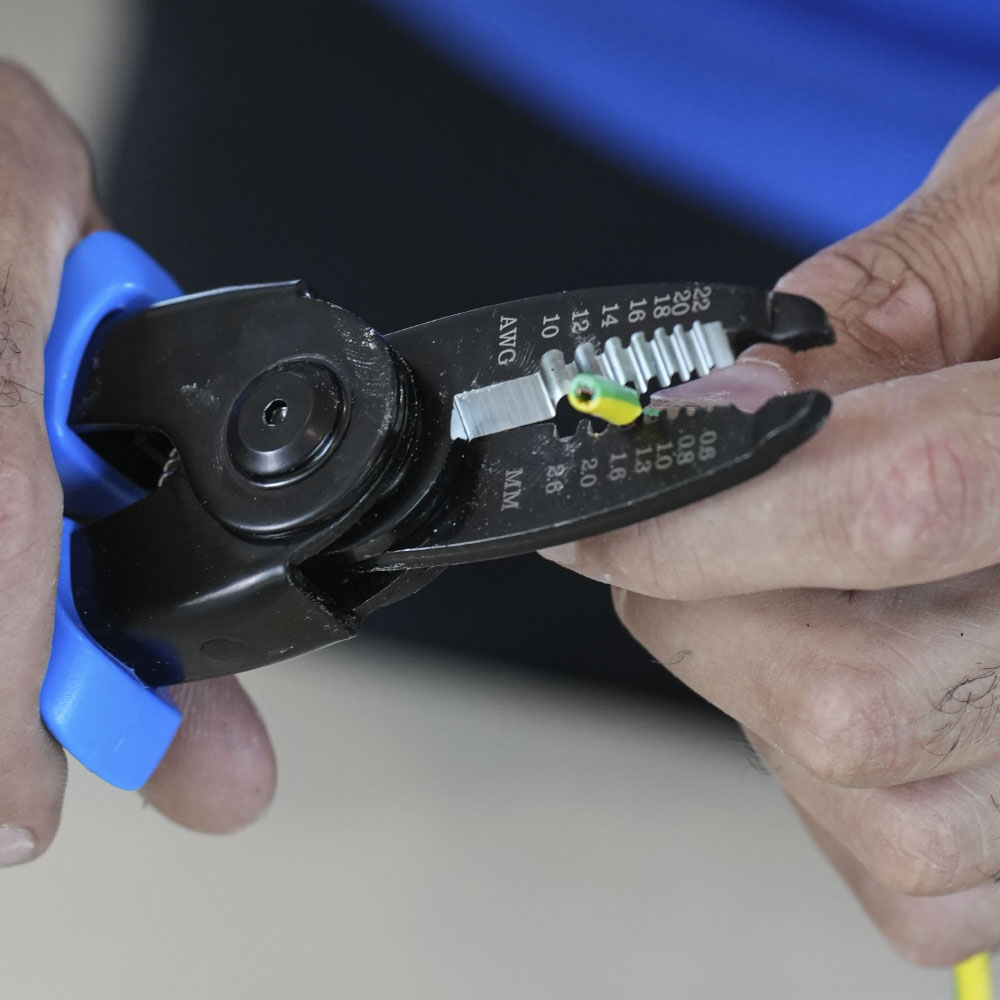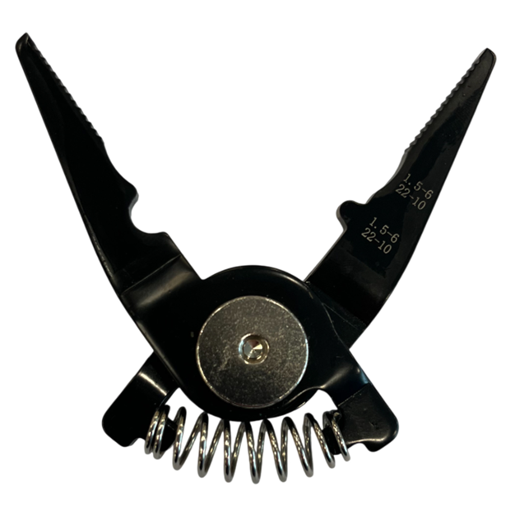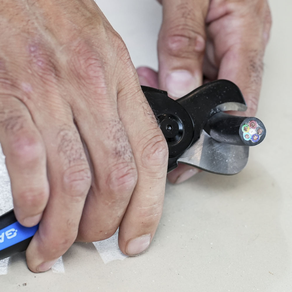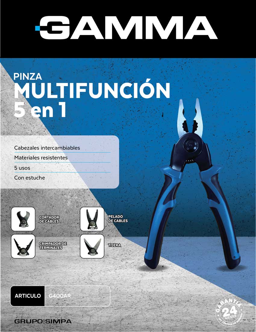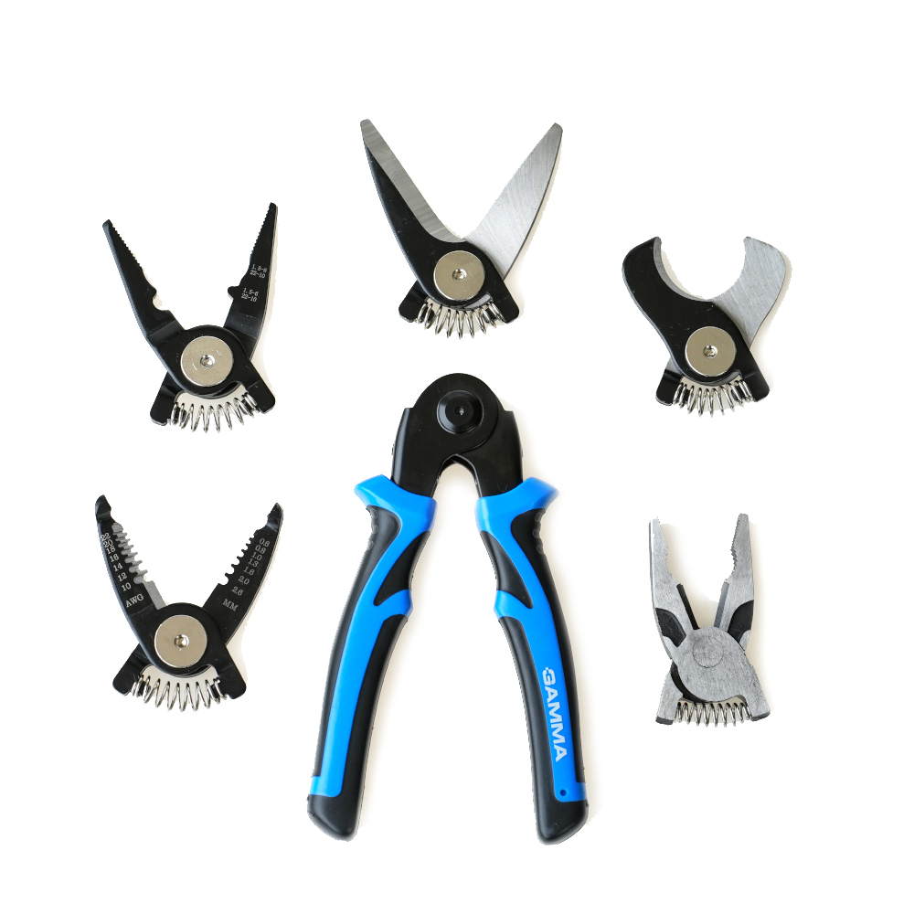 Kit de Pinzas de Alicates equipado con pelacables, alicate de engaste, cortador de cables, tijeras de electricista y alicate de línea. Con diseño de cambio rápido, cuenta con un sistema único de cabezal intercambiable que hacer un cambio rápido de diferentes herramientas con un solo mango. Basta tan solo con apretar con 2 dedos la punta y quitarla hacia arriba. Luego se puede colocar la punta deseada con el proceso inverso.