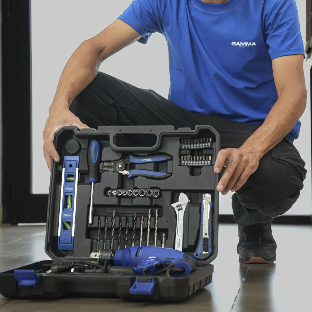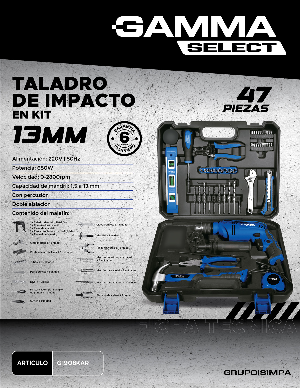 El Taladro de 650W con percusión, reversa y velocidad variable cuenta con empuñadura lateral y llave de mandril. Su maletín además cuenta con: